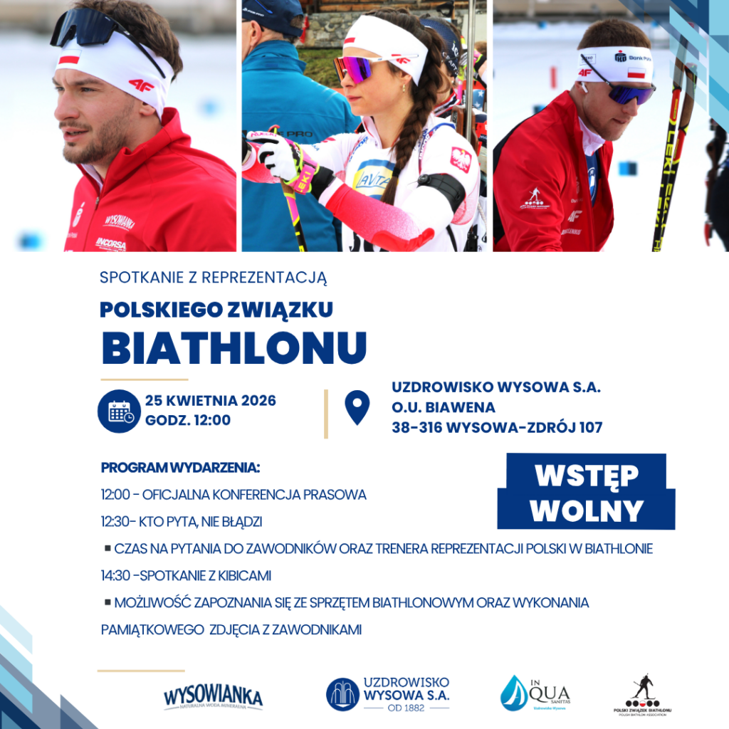 W dniach 20–30 kwietnia 2026 r. Reprezentacja Polski w biathlonie przebywać będzie w Uzdrowisku Wysowa S.A. Zawodnicy skorzystają m.in. ze strefy SPA BIAWENA oraz bazy zabiegowej, które wspierają regenerację organizmu po intensywnym okresie treningowym.